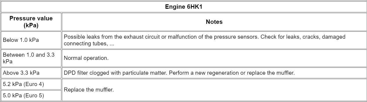 - With the engine at maximum speed, check the "Exhaust differential pressure" value in the parameters page and compare it to the table below.
